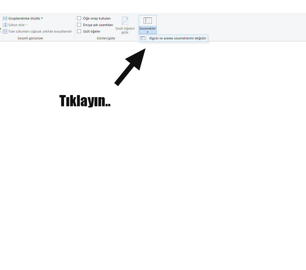 Öncelikle Dosya Gezgini’ndeki yani az önce açtığınız klasördeki Görünüm menüsünden bu defa en sağdaki Seçenekler‘e tıklayın. Açılan pencerede en üstteki sekmelerden Görünüm‘e tıklayın.